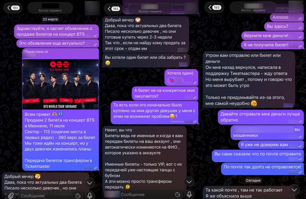Средняя стоимость билетов, которые мошенники предлагают в объявлениях, отличается от 1,8 тыс. рублей (например, такую сумму скамеры просили в апреле 2026 года за поддельный билет на концерт популярного артиста в Перми) до 30 тыс. рублей (примерно за такую сумму злоумышленники обещают передать билеты на выступление корейской группы BTS 11 июля в Мюнхене, Германия).