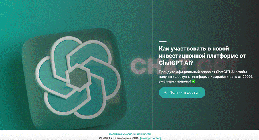 Злоумышленники в том числе используют модную тему искусственного интеллекта. Например, на одном из лендингов предлагается участвовать в «новой инвестиционной платформе ChatGPT AI и зарабатывать от 2000$». Подобные платформы работают на отдельном сайте, который не имеет никакого отношения к оригинальному бренду, а котировки и другие данные на нем формируются самими киберпреступниками.