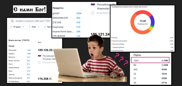 Еще большую часть порта 7547 занимает ПО EasyCWMP – это опен-сорсная реализация протокола CWMP. Наша СКИПА сумела определить 76 тысяч устройств в РФ, а Shodan в свою очередь нашел 600 тысяч в мире. Мы стали искать известные уязвимости, однако результат был нулевым, что очень странно, ведь ПО уже более 5 лет не обновлялось, да и написано на C – языке, на котором не все умеют разрабатывать безопасно. Кстати, Mirai Botnet построен был на уязвимости в RomPager, которая стрельнула неожиданно и массово, разрушая интернет, так что стоит быть начеку!