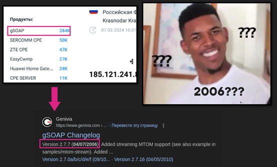 Определение программного обеспечения на порту 7547/TCP показало, что львиную долю занимает gSOAP, в особенности большая часть из них – это версии 2.7. Это ПО релиза 2006 года. Получается, что скоро всех ждёт на своем 20-летии.