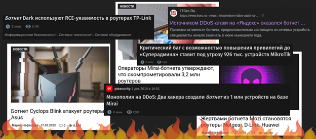 Почитали мы еще побольше про них новостей и заметили, что от этих домашних коробочек, которые лежат мирно у вас на полках, было немало проблем и вообще они периодически кибер-преступляют – бегают DDoS-ят, атакуют, поджигают Интернет.