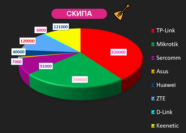 Это заставило нас задуматься и построить поверхность атаки в Рунете. Запустив нашу СКИПА, способную определять расположенный на порту сервис или ПО, мы получили внушительную статистику распространенности устройств таких вендоров, как TP-Link, Mikrotik, Keenetic, Sercomm, Huawei, ZTE, и так далее. Ниже представлена наглядная диаграмма этой статистики.