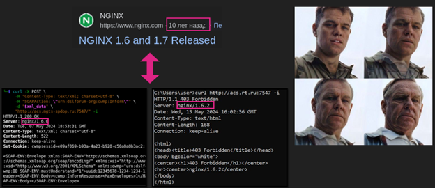 Мы решили пойти дальше и стали изучать взаимодействие на примере ACS и CPE и заметили, что элементарно незрелое ИБ со стороны некоторых провайдеров подчеркивается размещением на ACS устаревшего релиза Nginx версии 1.6, релиз которой был более чем 10 лет назад!