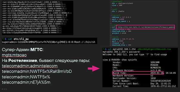 Порыскав немного в прошивках, можно найти различных зашитых пользователей, в том числе и операторских, найти URL-адреса куда ходят за обновлениями или ещё чем-либо, а также узнать о встроенном супер-админе, к которому на самом деле уже давно имеются пароли в чистом виде, что в свою очередь помогает подключиться к своей коробочке и познакомиться с ней еще ближе.