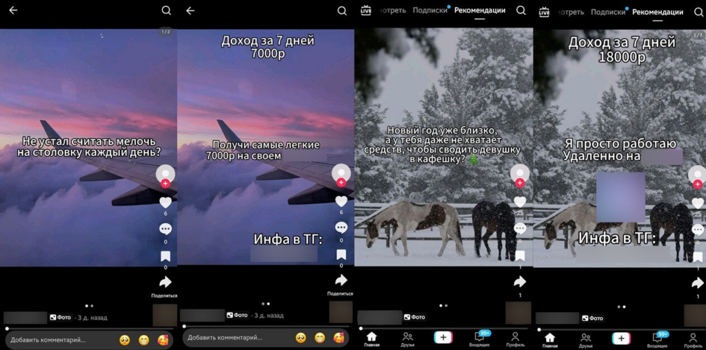 Начиная с декабря 2025 года, злоумышленники активно распространяют в TikTok короткие видео, которые обещают быстрый и лёгкий доход за короткий срок. Внимание привлекают такими фразами, как: «Не хватает средств, чтобы сводить девушку в кафешку?», «Устал считать мелочь на столовку каждый день?». Пользователям предлагают от 7 тыс. до 18 тыс. рублей за неделю. Для связи мошенники используют аккаунты в популярных мессенджерах.