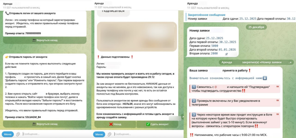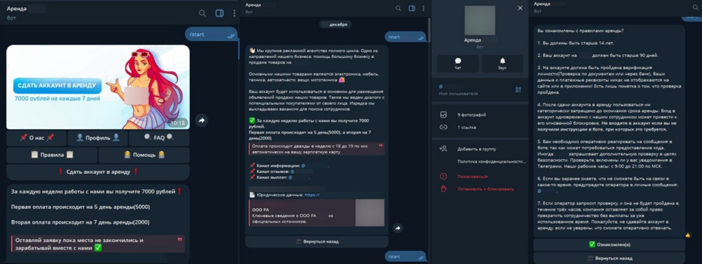 Пользователей, которые заинтересовались предложением, перенаправляют в мошеннический Telegram-канал, где объясняют суть схемы: получить деньги за аренду аккаунта популярного сервиса бесплатных объявлений. Передача учётной записи третьим лицам прямо нарушает пользовательское соглашение платформы, но мошенники об этом не упоминают.