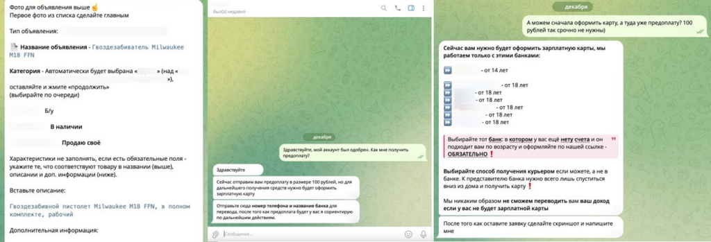 «Арендаторы» предъявляют строгие требования: пользователь должен быть старше 14 лет, срок регистрации аккаунта – более 90 дней, личность владельца аккаунта должна быть подтверждена на платформе. Киберпреступники сначала запрещают пользоваться учетной записью после её сдачи в аренду без их указаний, а затем просят владельца аккаунта опубликовать предлагаемое ими объявление. Также мошенники требуют от пользователя находиться на связи на случай, если сервис запросит код для дополнительной проверки безопасности.