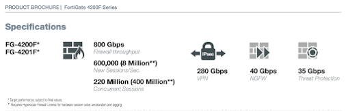 - 800 Гбит/с — это максимальная пропускная способность Fortinet 4200F в режиме когда вся безопасность выключена: L4 firewall.