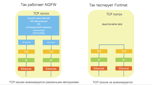 NGFW покупают для защиты сети, поэтому вам нужно выбирать устройство по производительности в режиме защиты. Это важно. И этот параметр указывает каждый производитель (смотрите на параметр Threat Prevention в datasheet). Ведь именно в этом режиме будет работать устройство в вашей сети. Зачем все эти другие скорости в Datasheet? Только сбивают с толку. Что делает NGFW для защиты: ищет туннелирование приложений внутри 443, 80 и 53 порта (которые всегда открыты в сети), в нем работает URL фильтр, IPS и антивирус, и другие движки современные.