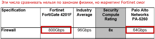 В своем пресс-релизе Fortinet сравнивает производительность 4200F с всеми выключенными проверками и Palo Alto Networks PA-5260 с включенным контролем приложений. Это абсурд. С тем же успехом можно было сказать, что 800 рублей больше чем 64 доллара, причем, по мнению маркетинга, аж в 8 раз! ) В реальности 4200F выдает в режиме NGFW 40 Гбит/с, то есть в 20 раз меньше, что четко указано в их datasheet: