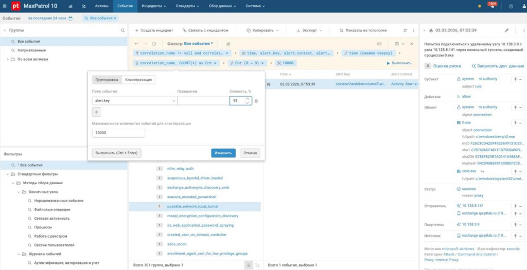 В рамках обновления MaxPatrol SIEM российскому рынку впервые была представлена функция, позволяющая с помощью ML-технологии объединять однотипные события в кластеры. Для каждого кластера автоматически формируются регулярные выражения, что незаменимо при работе с табличными списками и событиями.