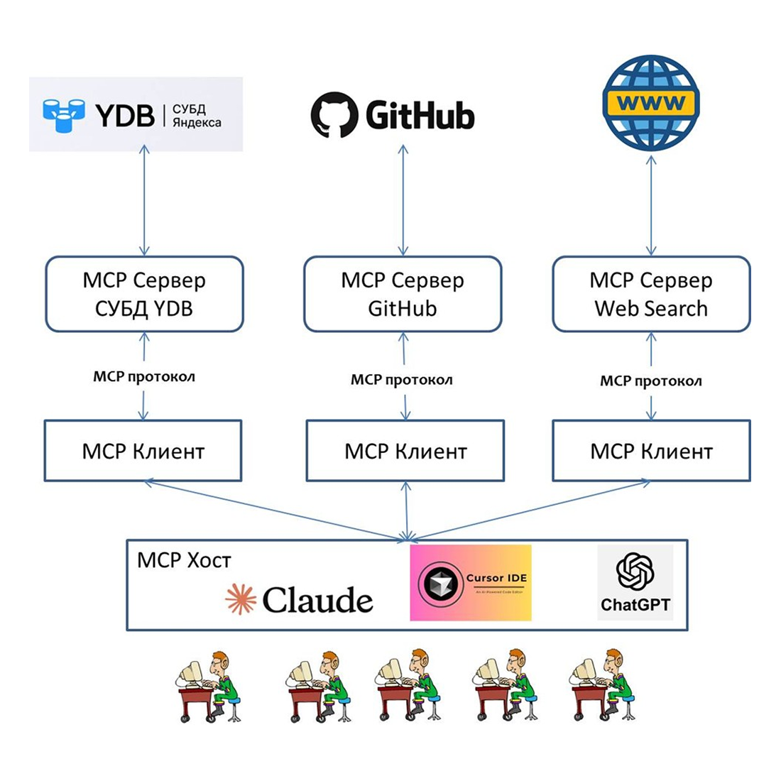 - Ответ пользователю: Сформированный ответ выдается пользователю через интерфейс MCP Х (Claude, IDE и пр.).
