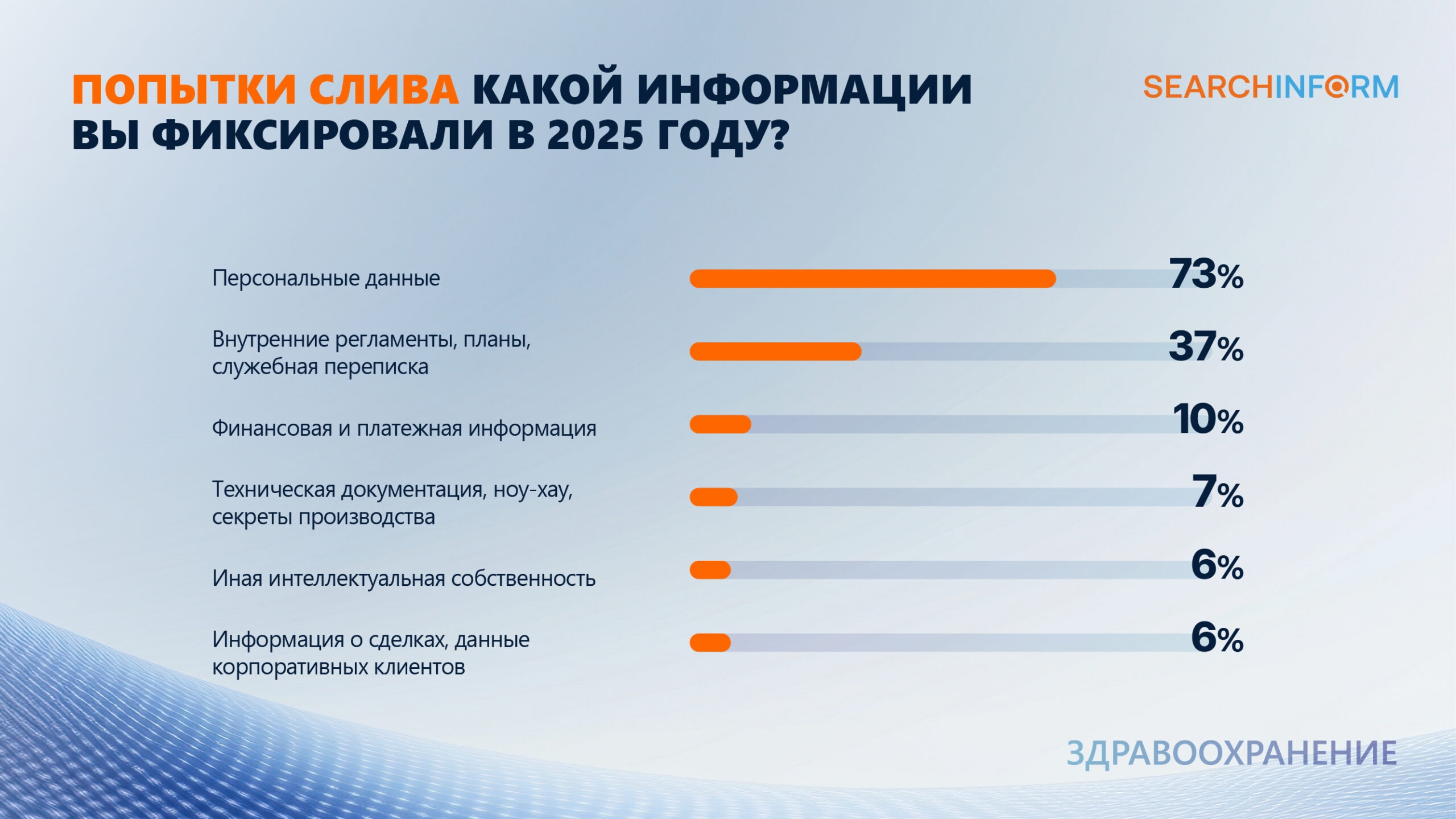 Чаще всего в 2025 году организации фиксировали попытки слива персональных данных (73%), внутренних регламентов и служебной переписки (37%), финансовой информации (10%). Об утечках технической документации и интеллектуальной собственности 7% и 6% опрошенных соответственно.*