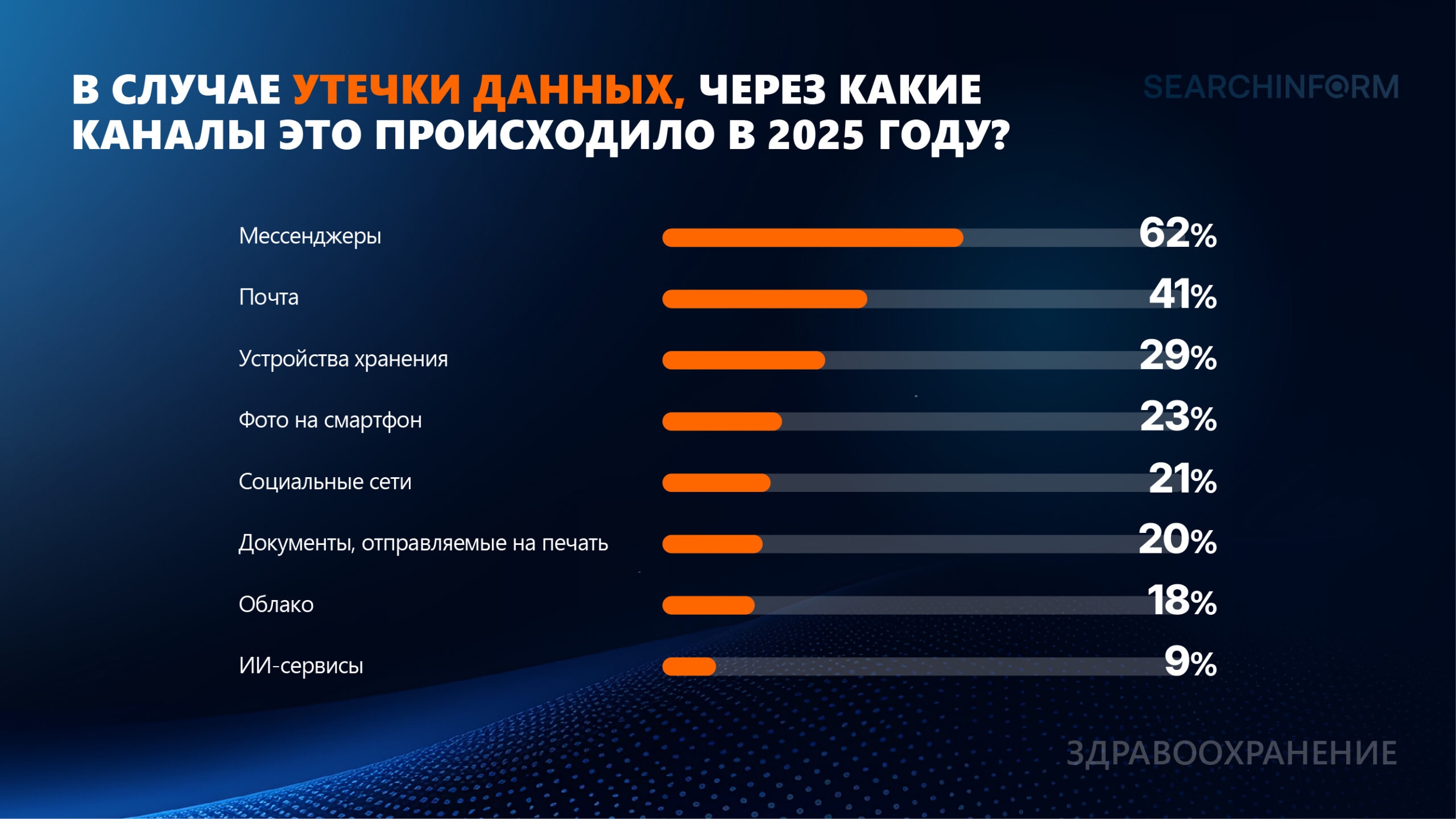 Основными каналами, через которые сотрудники организаций здравоохранения сливали информацию, в 2025 году были: мессенджеры (62%), почта (41%) и устройства хранения (29%). Также нередко конфиденциальные данные утекали через фотографии со смартфонов (23%) и социальные сети (21%). *