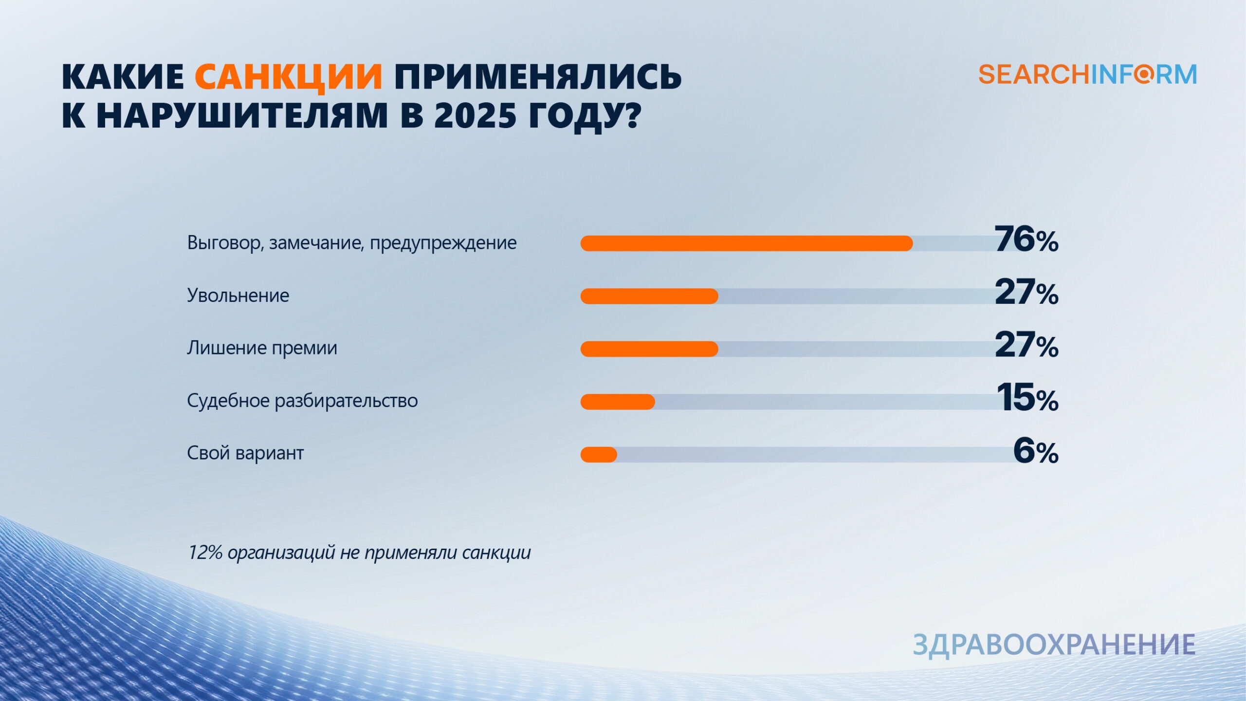 Большинство компаний, столкнувшихся с ИБ-инцидентами, применяли к нарушителям выговор, предупреждение или замечание (76%). Санкции в виде увольнения применяли к нарушителям 27% медицинских организаций, еще столько же – лишали премии. Инциденты доходили до суда лишь у 15% опрошенных компаний.12% работодателей никак не наказывали нарушителей.*