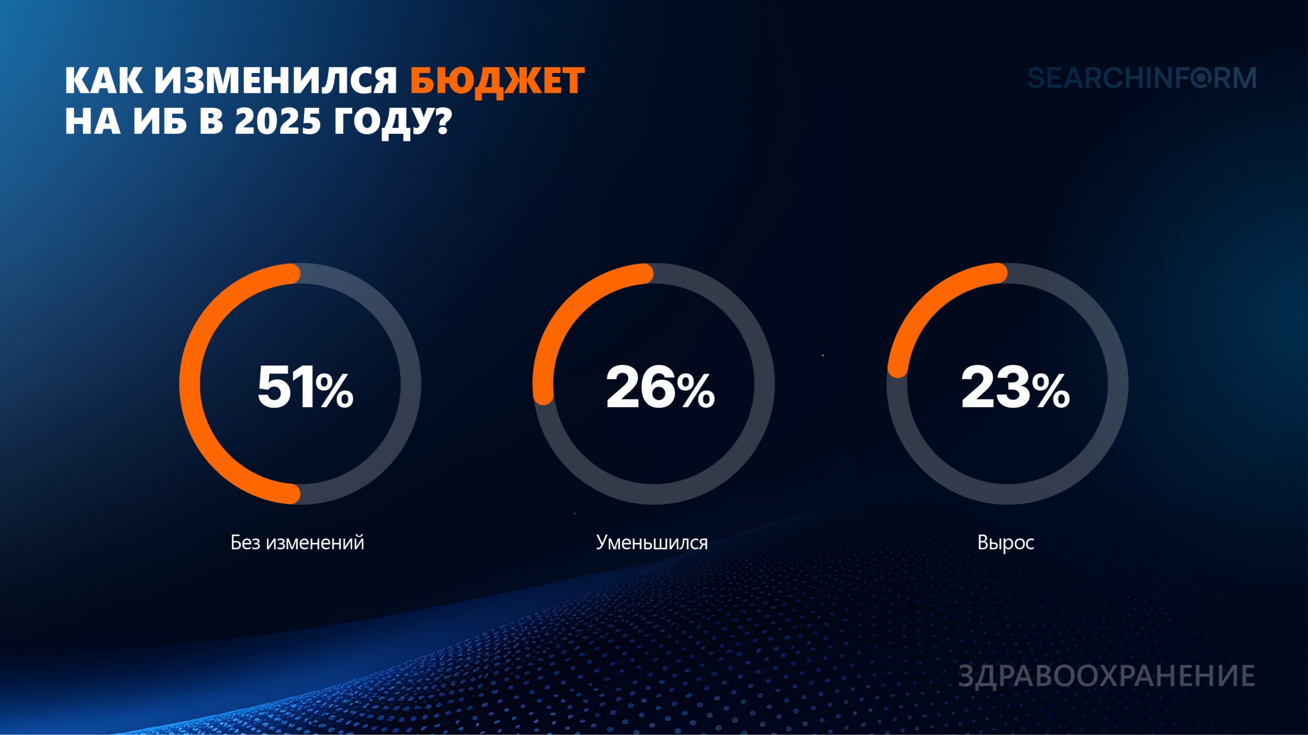 В 2025 году 23% опрошенных компаний сообщили, что увеличили бюджеты на ИБ, 51% оставили бюджет без изменений, 26% опрошенных сократили финансирование.
