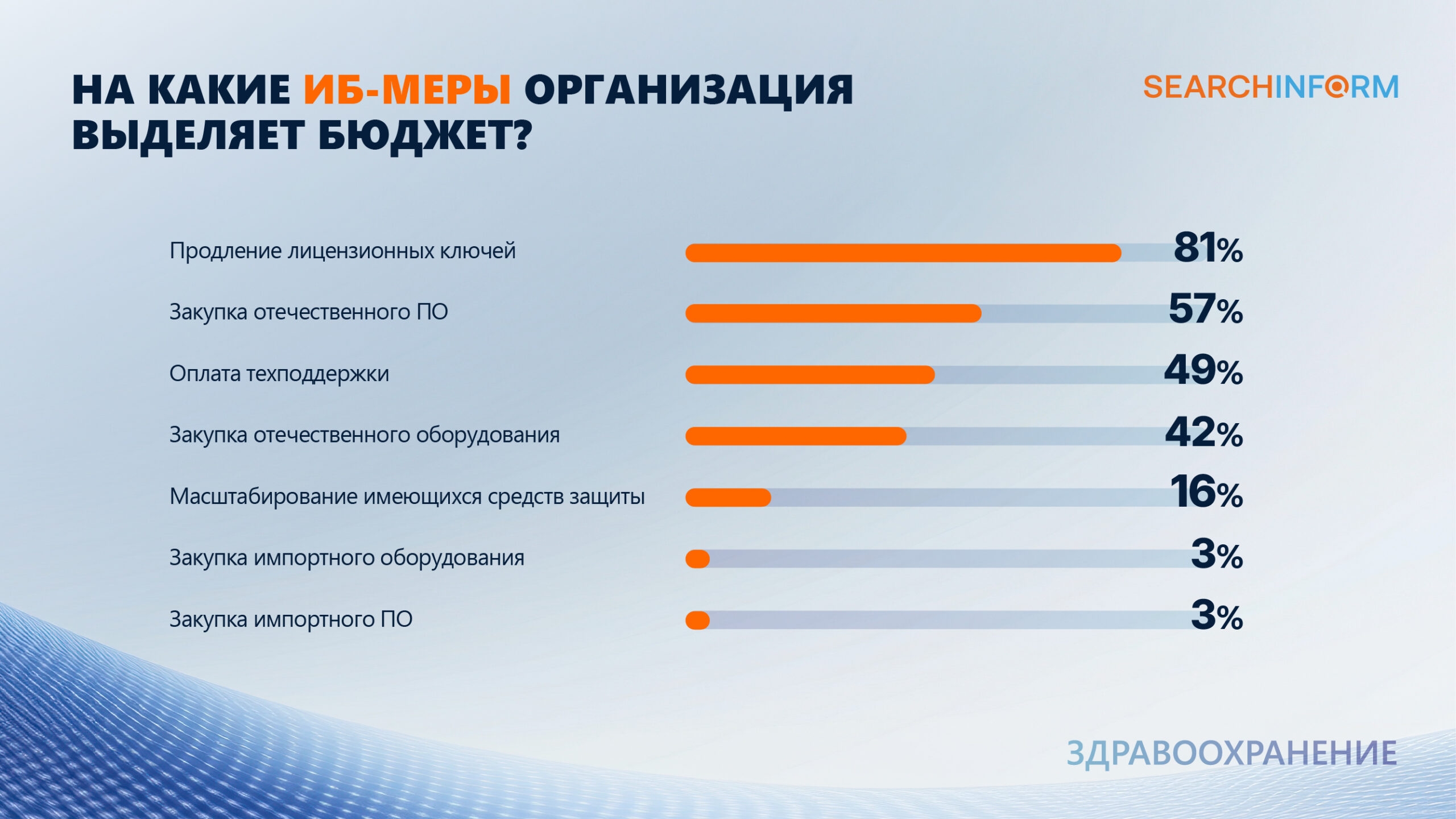 Большинство медицинских организаций направляют бюджеты на продление лицензионных ключей (81%), закупку отечественного ПО (57%) и оплату техподдержки (49%). На закупку отечественного оборудования выделяют средства более половины опрошенных (42%). В меньшей степени в 2025 году российские организации из сферы здравоохранения направляли бюджеты на масштабирование внедренных средств защиты (16%).*