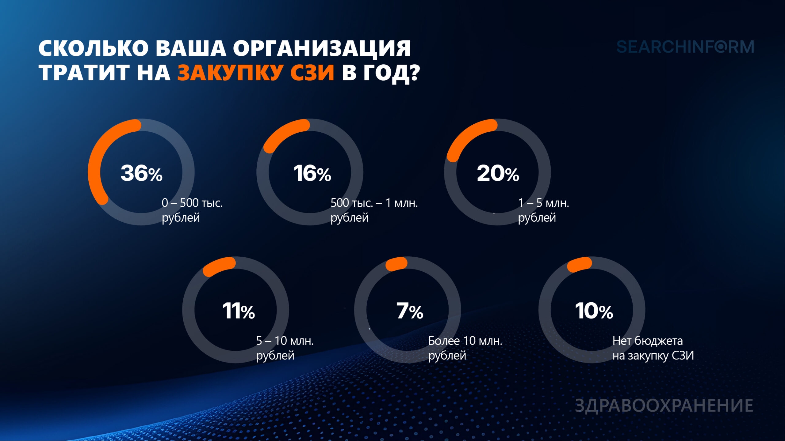 Больше трети опрошенных организаций тратят на закупку СЗИ в год до 500 тысяч рублей. От 500 до 1 миллиона тратят 16% опрошенных.