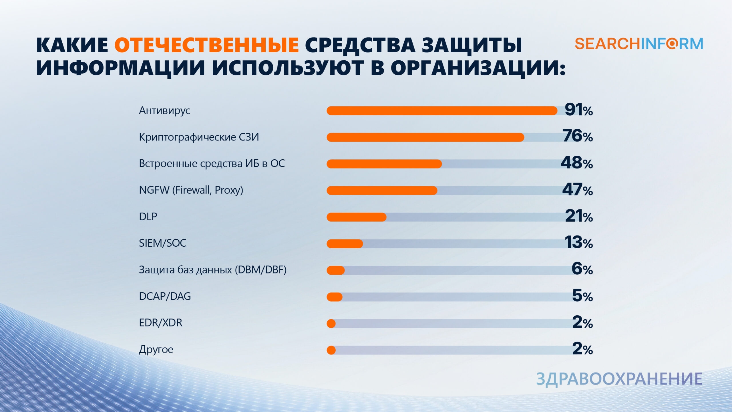 В рамках исследования эксперты «СёрчИнформ» выяснили, какие российские средства защиты информации используют в организациях здравоохранения. Основные инструменты: антивирус (91%), криптографические СЗИ (76%), встроенные средства ИБ в ОС (48%). Отечественные DLP-системы для защиты информации от утечек используются лишь в 21% медицинских организаций.*