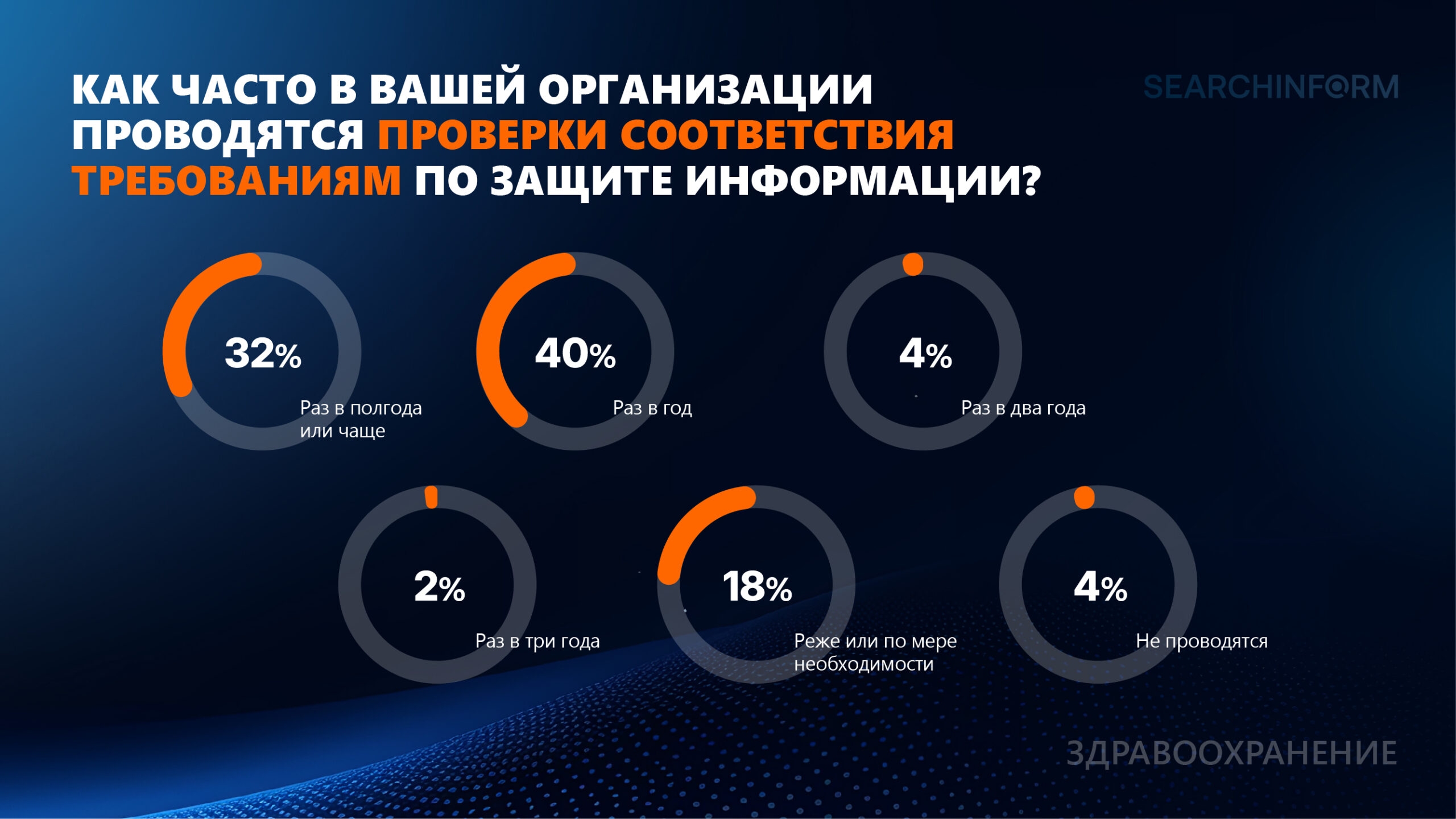 Также эксперты «СёрчИнформ» выяснили, как часто медицинские организации проводят проверки соответствия мер требованиям по защите информации. Большинство опрошенных проводят проверки раз в год (40%) или раз в полгода (32%).