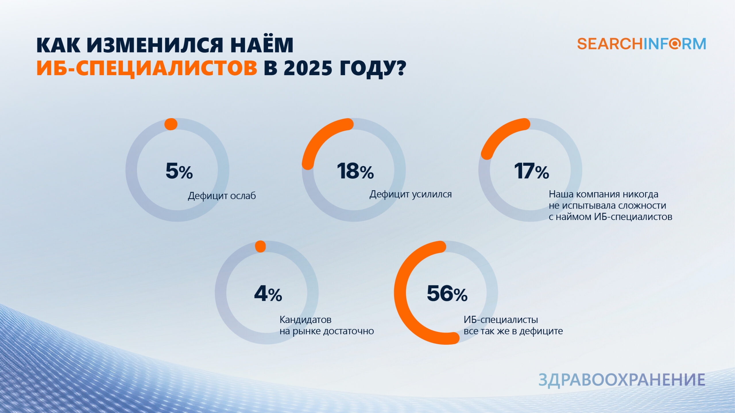 В организациях из сферы здравоохранения дефицит кадров в области информационной безопасности продолжает расти — об этом заявили 18% опрошенных. Лишь 4% считают, что специалистов на рынке достаточно, 17% компаний никогда не испытывали сложностей с наймом ИБ-кадров.