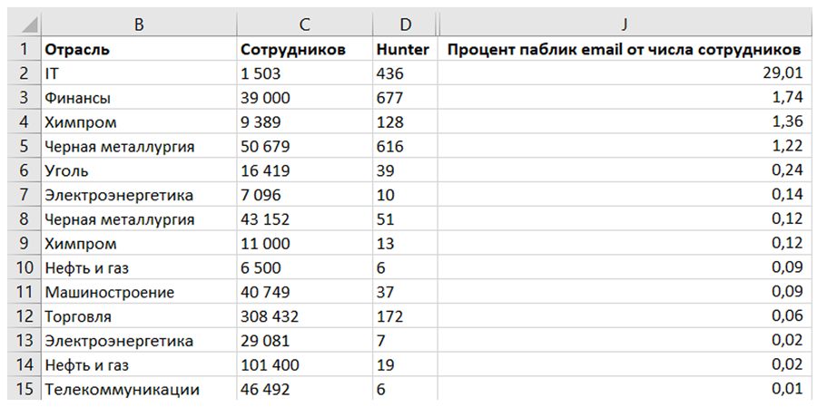 Пример количества email в открытом доступе. Вместо организаций написаны их отрасли: