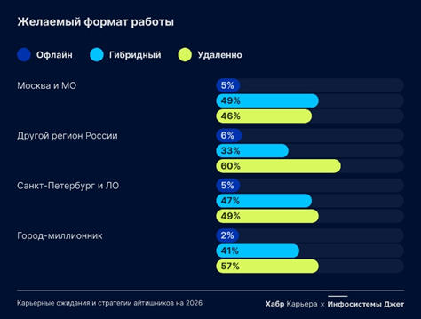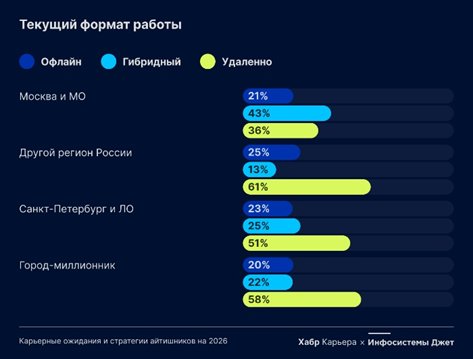 На фоне новостей о возвращении сотрудников в офисы в западных компаниях российский рынок выглядит стабильнее с точки зрения гибких форматов занятости. Почти половина опрошенных работает удаленно, около 20% сейчас работают из офиса, но на самом деле работать офлайн хотели бы лишь 5% специалистов. Гибридный формат особенно популярен в Москве и Московской области, тогда как в регионах преобладает удаленка.