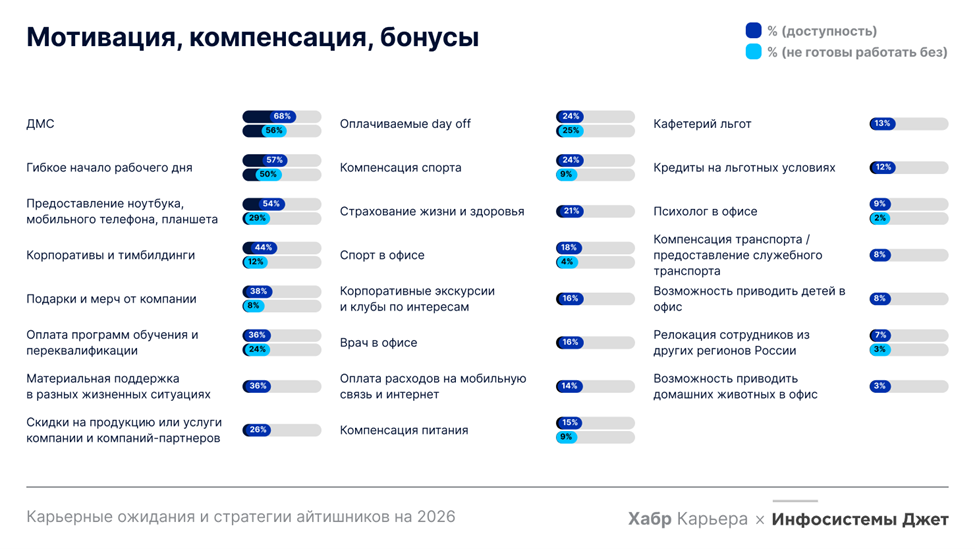 В части мотивации лидером остается ДМС: оно входит в топ-5 самых доступных опций и одновременно в список условий, без которых айтишники не готовы работать. В тот же «базовый минимум» попадают гибкое начало рабочего дня, наличие корпоративной техники, например, ноутбука, а также оплачиваемые отгулы и больничные. Корпоративы и мерч, хоть и присутствуют в большинстве компаний, оказываются в конце списка того, что действительно важно для комфортной работы.