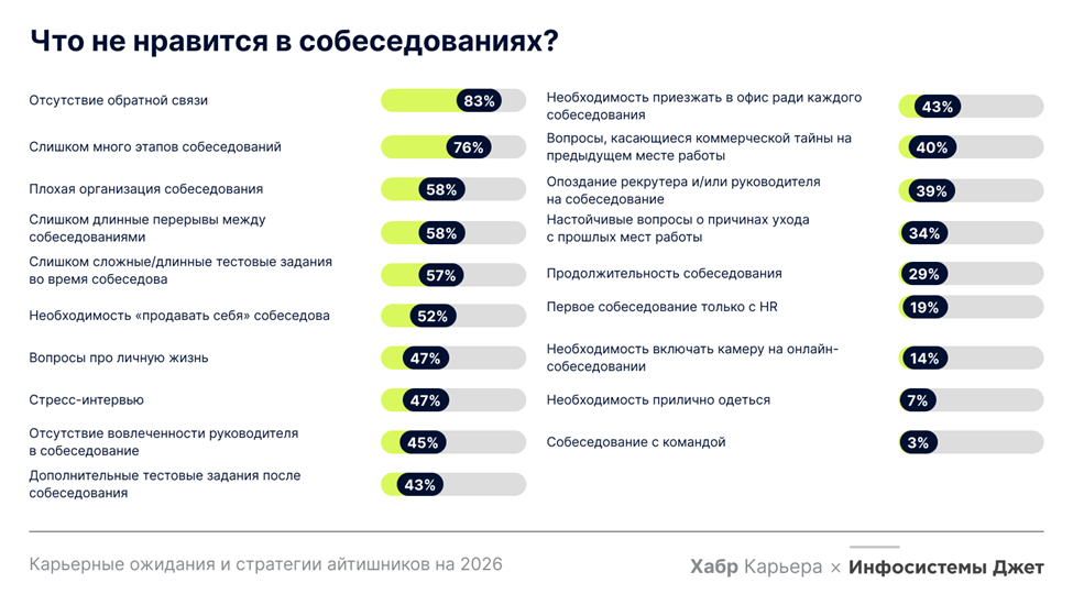 На уровне грейдов картина различается. Стажеры и джуны чаще других испытывают стресс от необходимости «продавать себя» на собеседовании (62%), тогда как среди топ-менеджеров этот показатель составляет 31% при среднем уровне 52%. Сеньоры чаще других выступают против дополнительных тестовых заданий (50%), а лиды особенно чувствительны к низкой вовлеченности руководителя в интервью (54%).