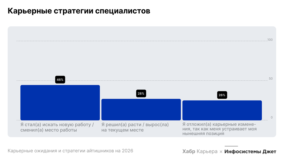 Исследование «Инфосистемы Джет» и Хабр Карьеры «Карьерные ожидания и стратегии ИТ-специалистов 2025–2026: что изменилось на рынке труда» показало, что для каждого второго айтишника категорически важны ДМС и гибкий график, а удаленка и вовсе стала самым востребованным форматом работы. Также в 2025 году большинство опрошенных ИТ-специалистов предпочитали стабильность и рост в стенах одной компании.
