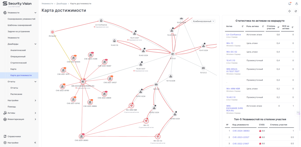Реализован механизм построения графа достижимости уязвимостей на основе сетевой топологии инфраструктуры. Система автоматически анализирует правила межсетевых экранов и маршрутизацию, определяя, какие уязвимые системы могут быть достигнуты потенциальным атакующим из различных точек сети. Это позволяет точнее оценивать реальные риски и приоритизировать устранение уязвимостей с учётом их фактической достижимости, а не только теоретической критичности.