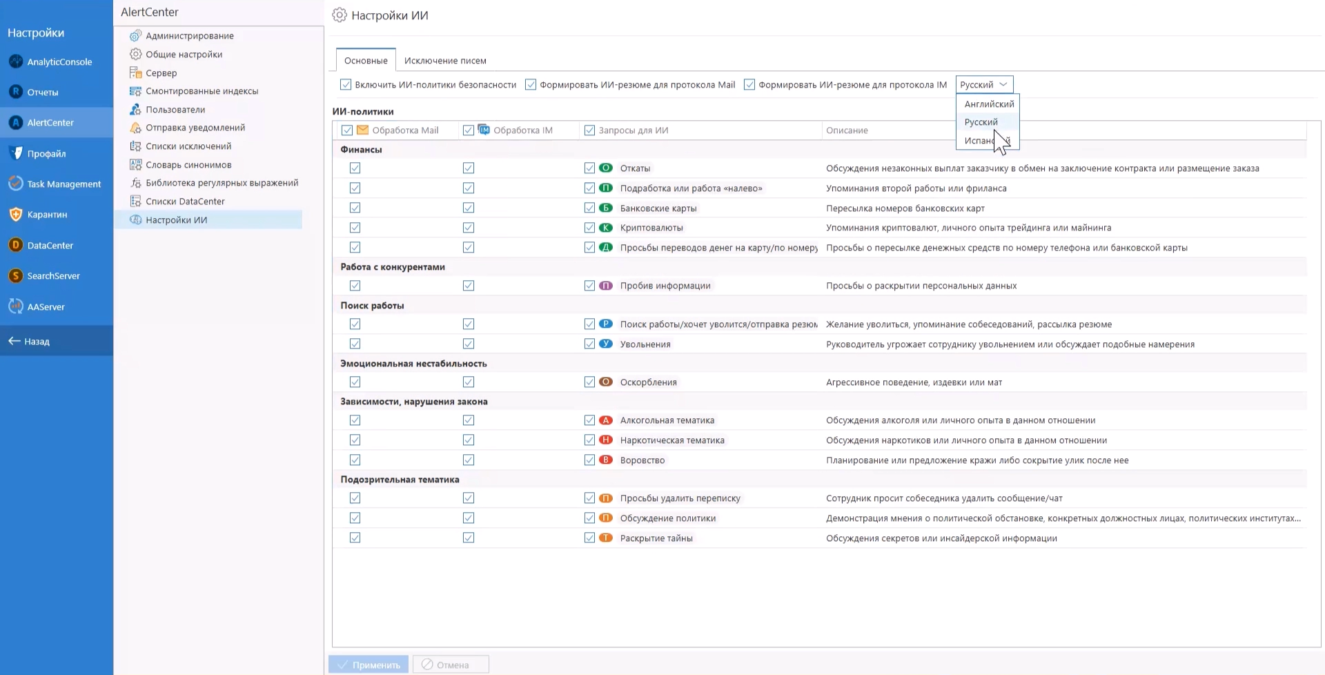 Доступны три сценария. Первый – автоматическая маркировка инцидентов. Модель анализирует почту, чаты и вложения, распознает контекст и присваивает событиям готовые метки: «откат», «пробив», «воровство», «раскрытие тайны» и другие. Всего поддерживается более 15 типов инцидентов, политики ИИ уже предустановлены в AlertCenter и не требуют настройки.