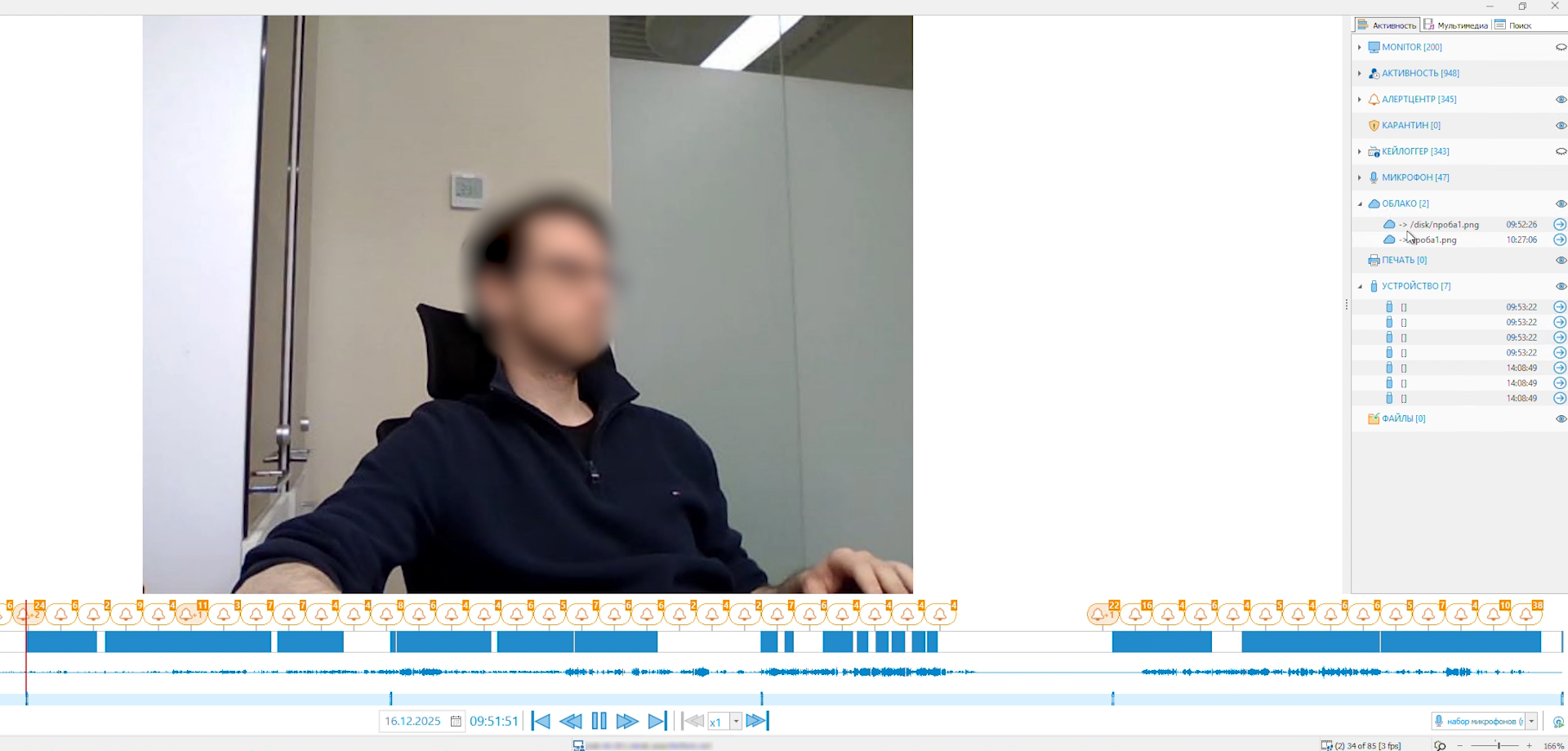 В КИБ появился новый инструмент расследования – объединенный видеоцентр. Он пришел на смену стандартному плееру MonitorController и теперь показывает не просто запись экрана или веб-камеры, а полную картину событий. В одном окне отображаются съемка с веб-камеры или экрана, аудиодорожка с микрофона, активные программы и сайты в момент записи, а также события из других каналов: копирование на флешку, печать, отправка в облако. Из нового плеера можно в один клик перейти к деталям инцидента, модулю поиска или связанным событиям. Это ускоряет расследование в разы – не нужно собирать данные по разным вкладкам, все уже связано по времени и контексту.