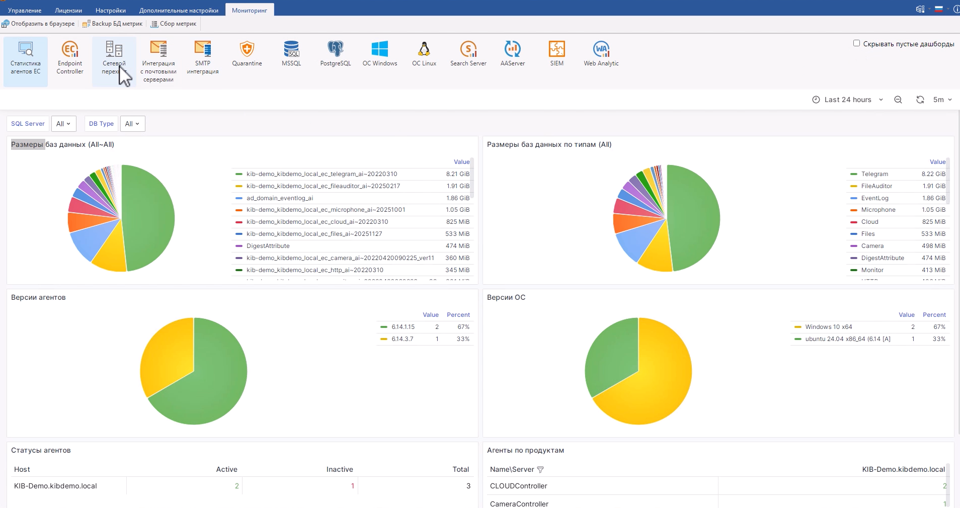 Главный центр управления КИБ – консоль DataCenter – расширил возможности мониторинга компонентов. У всех дашбордов появились названия, навигация стала прозрачнее. Метрики «БД на SQL-серверах» переехали во вкладку «Статистика агентов EC». Дашборд NetworkController разделен на три самостоятельных: «Сетевой перехват», «Интеграция с почтовыми серверами» и «SMTP-интеграция». Пустые дашборды теперь можно скрывать – флаг «Скрывать пустые дашборды» находится в правом верхнем углу вкладки «Мониторинг».
