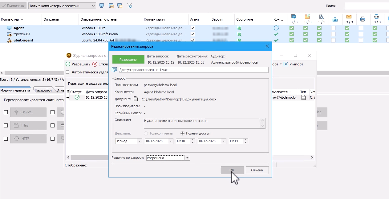 В FileAuditor появился механизм открытого контроля с запросом доступа к документам. Если сотруднику для работы нужен заблокированный файл, службе ИБ не придется переписывать все политики доступа – достаточно точечно предоставить временный.