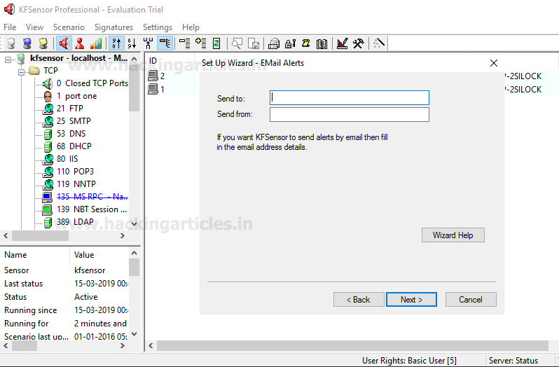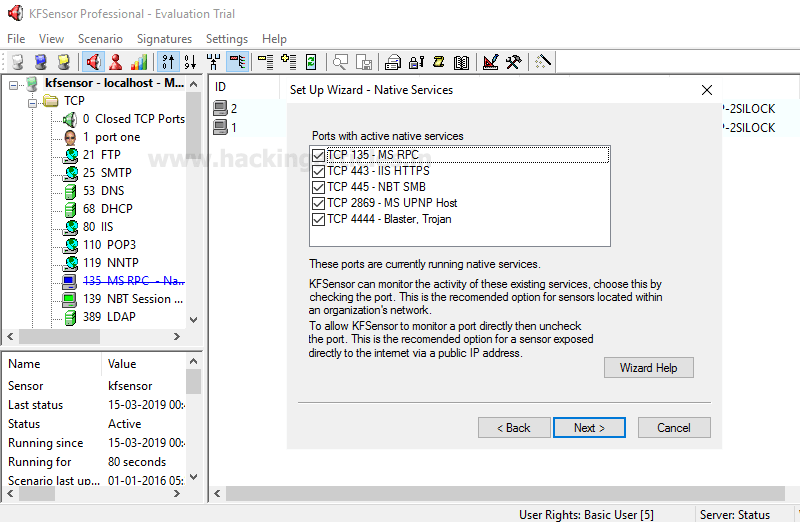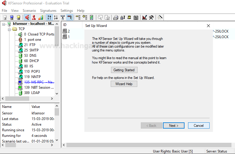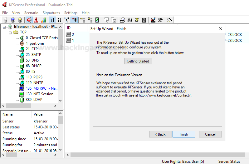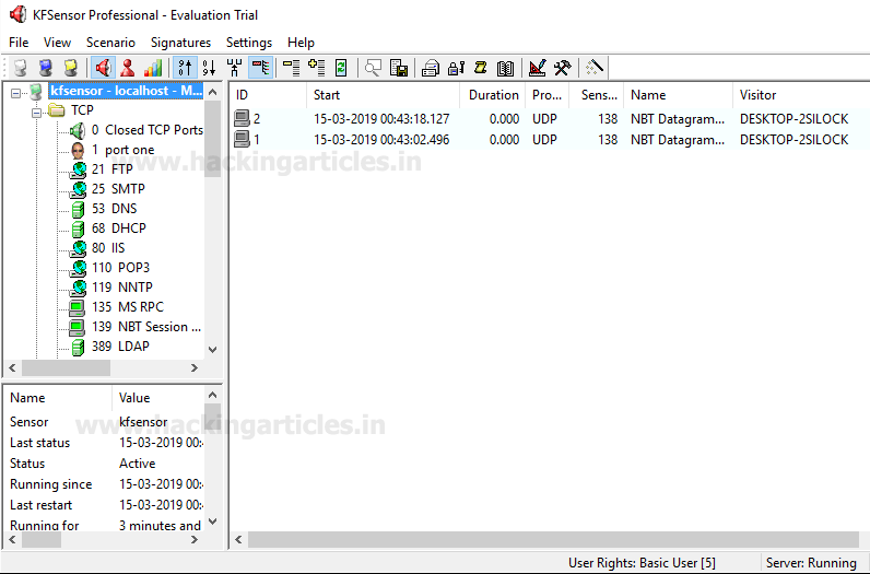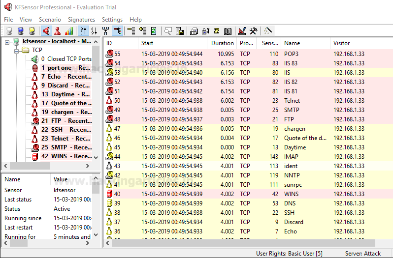 Роль KFSensor состоит в том, чтобы быть сервером-приманкой для атакующих хакеров, чтобы защитить реальный сервер. Он отлично справляется со своей работой, создавая поддельные порты в системе, где он установлен, и собирая информацию при подключении к машине злоумышленника. Инструмент делает это точно так же, как и обычная серверная программа, такая как веб-сервер или SMTP-сервер. Таким образом, он устанавливает цель (сервер Honeypot), который будет записывать действия злоумышленника.