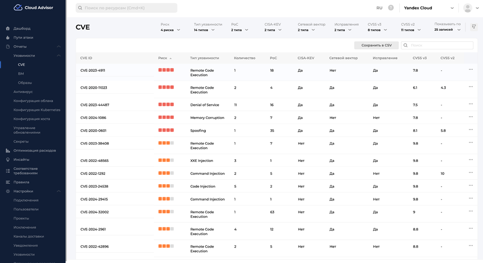 Важным отличием Cloud Advisor от традиционных сканеров уязвимостей является использование контекста при приоритезации уязвимостей. Например, уязвимость RCE на публично доступной машине, на которой найдены ключи доступа от объектного хранилища, будет иметь больший приоритет, чем та же уязвимость на машине без доступа в интернет.