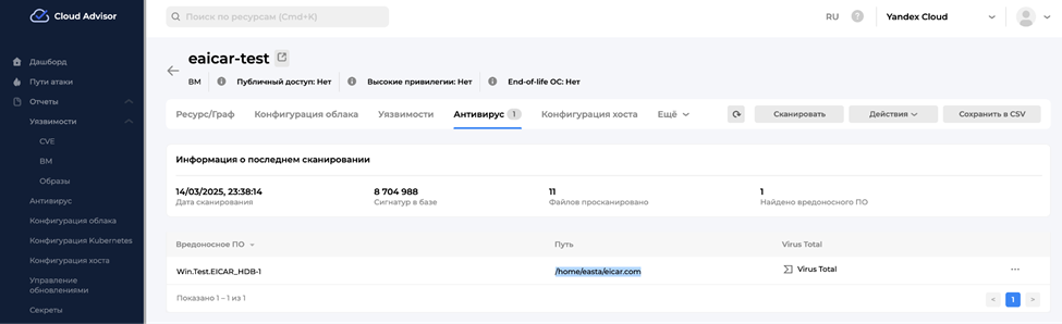 Аналогично без использования агентов Cloud Advisor ведет поиск вредоносных файлов – не нужно тратить время для установки агента на каждую виртуальную машину. Благодаря тому, что производится сканирование снапшота вместо сканирования оригинальной ВМ, такой способ не влияет на производительность сканируемого объекта (что часто бывает недопустимо для высоконагруженных приложений).