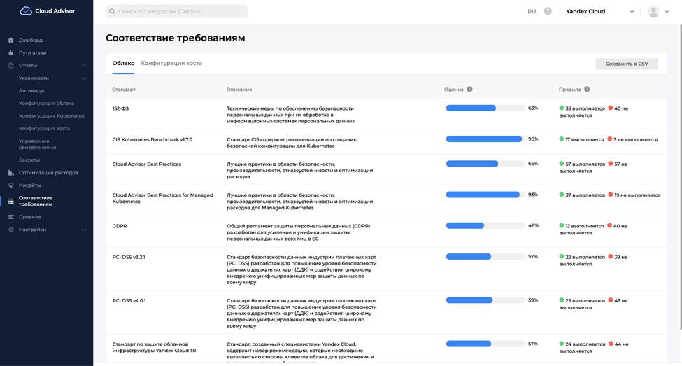 Если вы внимательно смотрели на скриншоты в предыдущих разделах, то могли заметить, что результаты сканирований отображаются в пункте меню «Отчеты» – правда, фактически, это интерактивная кликабельная аналитика по обнаруженным проблемам. Но отчеты в привычном понимании – выгружаемые документы – в Cloud Advisor тоже есть. Для каждого раздела проверок можно выгрузить результаты в CSV. А в разделе «Соответствие требованиям» для каждого стандарта доступна выгрузка PDF-отчета с настраиваемой полнотой информации.