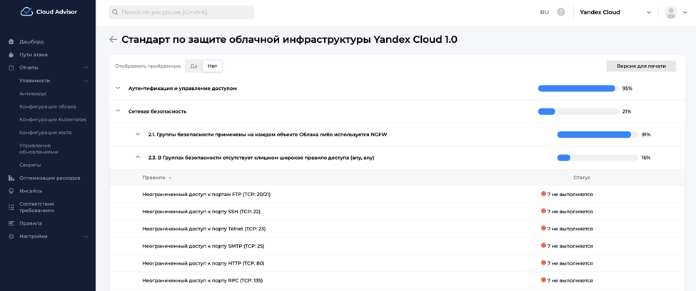 Cloud Advisor проверяет публичное облако на соответствие требованиям регуляторов (152-ФЗ, PCI DSS, GDPR), лучшим практикам вендоров и индустрии (CIS Benchmarks). В результате для каждого стандарта выводится процент выполненных требований с возможностью раскрыть стандарт и посмотреть детальную информацию по непройденным проверкам – суть проверки и список активов, не соответствующих требованиям.
