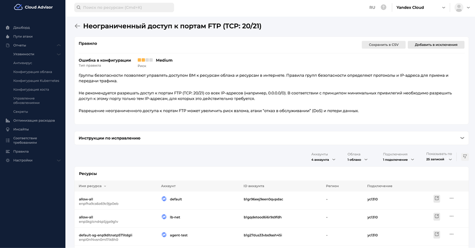 А с помощью API внешние системы могут получать из Cloud Advisor информацию о любых ресурсах в облаке (например ВМ, контейнерах, пользователях, группах безопасности и так далее) и рисках безопасности (сработавшие правила, найденные уязвимости).