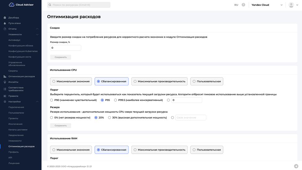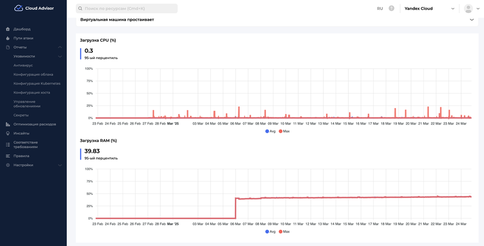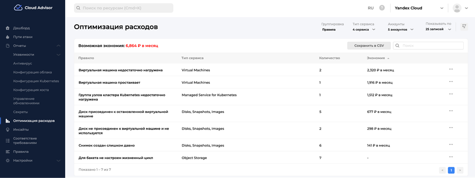 Другой ключевой возможностью Cloud Advisor является оптимизация расходов на облачные сервисы. Система анализирует использование ресурсов, выявляет возможности оптимизации (неиспользуемые или недозагруженные активы), если необходимо посоветует выбрать менее мощную конфигурацию и даст рекомендации по процессору и памяти, которые смогут обеспечить корректную загрузку виртуальной машины, управляемого сервиса или базы данных.