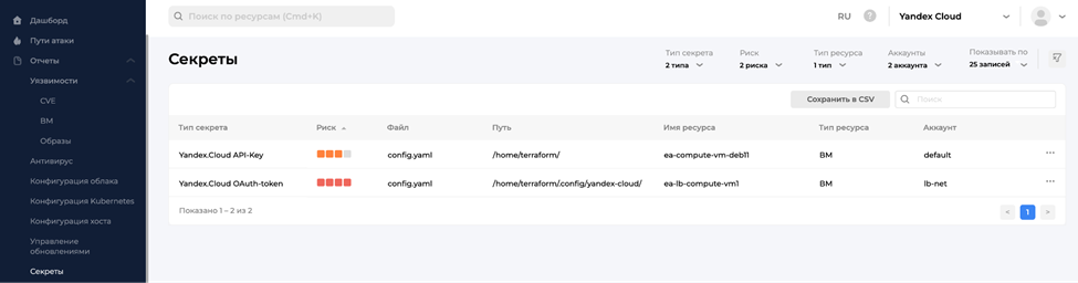 Модуль «Поиск секретов» ищет хранящиеся в открытом виде (например, просто записанные в conf-файле) секреты (API-ключи, IAM Cookies, IAM-токены, OAuth-токены, ключи от S3, GitLab, GitHub и другие). При нахождении секрета в консоли Cloud Advisor отображается ресурс, на котором был найден секрет, и путь к файлу с ним.