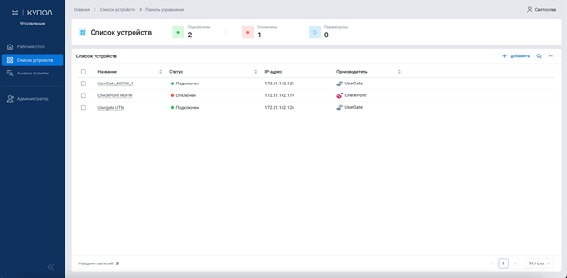 Чтобы иметь возможность добавить новый межсетевой экран, на нем нужно создать пользователя с административными правами и разрешениями на подключение по API. На момент написания обзора «НОТА КУПОЛ. Управление» поддерживал добавление устройств Usergate и CheckPoint, но уже до конца 2023 года разработчики планируют добавить поддержку Cisco ASA, Cisco Firepower и АПКШ «Континент».