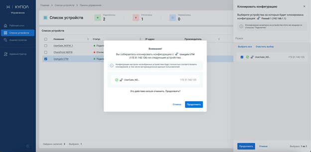 Еще единая консоль «НОТА КУПОЛ. Управление» позволяет осуществлять резервное копирование конфигурации межсетевого экрана. Потом эту конфигурацию можно раскатить на тот же МЭ или на другое устройство – это значительно ускорит перенастройку и ввод в эксплуатацию.