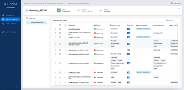 После добавления устройства в интерфейсе «НОТА КУПОЛ. Управление» становятся доступны политики, правила и слои правил (для CheckPoint). Можно создавать, отключать, удалять и изменять правила, в том числе их порядок.