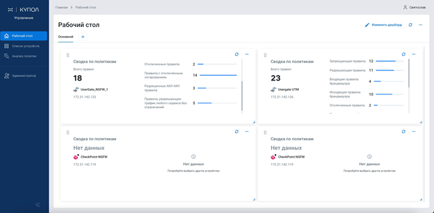 Для удобства работы со сводной информацией «НОТА КУПОЛ. Управление» предлагает настраиваемые дашборды. Пользователь выбирает расположение, размер и наполнение виджетов: можно вывести результаты анализа политик в различных разрезах по всем подключенным межсетевым экранам или же отобразить это только по необходимым устройствам.
