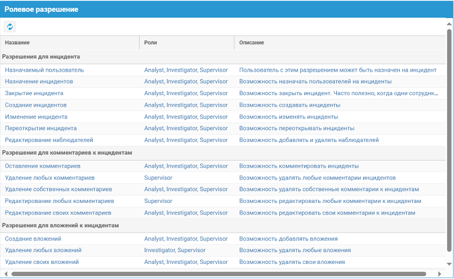 • через формирование отчета по готовому шаблону xml-отчета (после формирования отчет отправляется по электронной почте. - Пользователи и ролевая модель. Система поддерживает детальную ролевую модель. Пользователи могут быть локальными или загруженными из AD/LDAP. Права можно назначать гибко: например, разрешить редактировать комментировать инцидент, но не добавлять вложения – или наоборот.