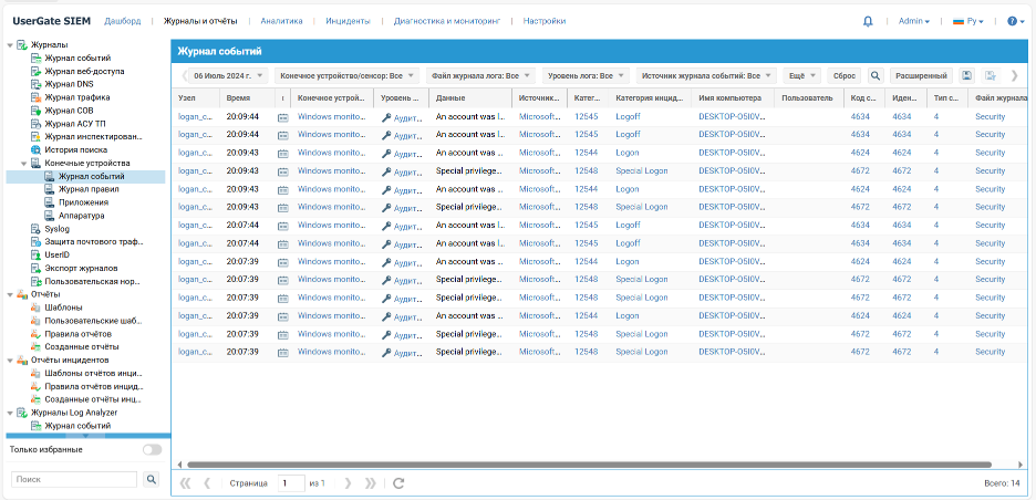 • UserGate NGFW (журналы самого устройства и сетевого трафика, проходящего через него)