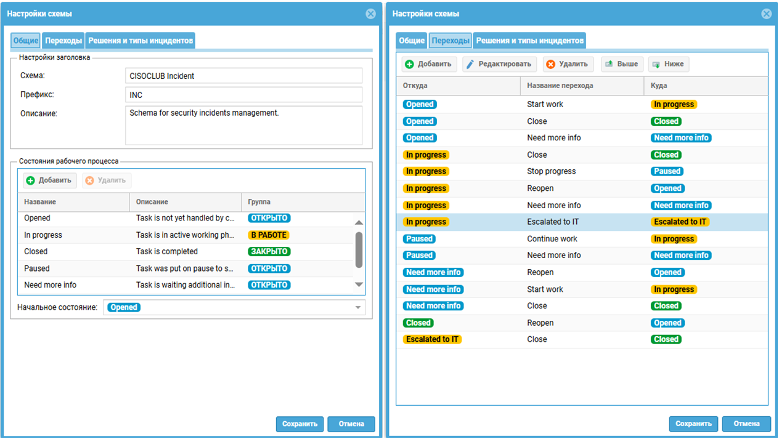 Цикл обработки настраивается: можно задать свои этапы (в работе, на проверке, закрыт и т.д.), логику переходов между ними и типы вердиктов. Это удобно для регламентации работы аналитиков SOC.